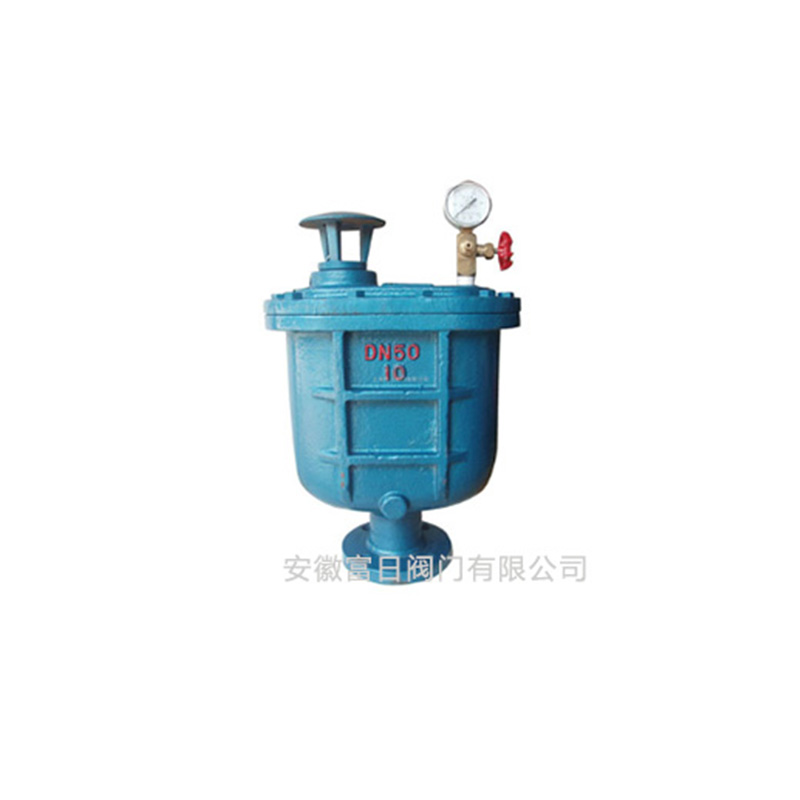 安徽富日閥門生產的復合式排氣閥該閥結構為圓筒型,閥門內件包括不銹鋼浮球、杠桿及閥瓣。本閥安裝在泵出口處或送佩水管線中,用來排除集積在管中的空氣,以提高管線及水泵的使用效率,當管內一旦產生負壓時,此閥迅速吸入外界空氣以防止管線因負壓而損壞。