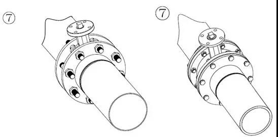 2、按圖示將兩端螺栓螺母分別輕輕插入兩端對(duì)應(yīng)的法蘭孔(法蘭式蝶閥需調(diào)整墊片位置),將螺母稍加擰緊以校正法蘭面的平面度;