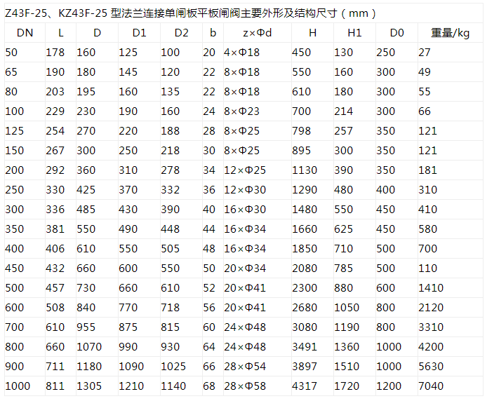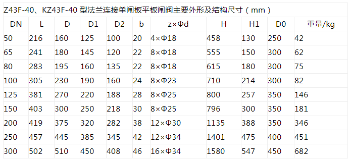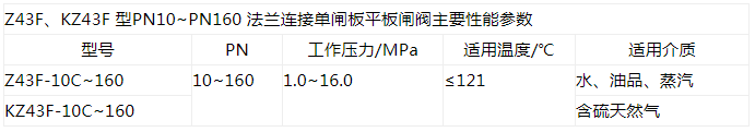 Z43F、KZ43F 型PN10~PN160 法蘭連接單閘板平板閘閥:手動、法蘭連接、明桿平行式剛性單閘板,閥座密封面材料為鉻不銹鋼+聚四氟乙烯,公稱壓力PN16~PN160,閥體材料為碳素鋼(Z43F-10C~160)、抗硫化處理碳素鋼(KZ43F-10C~160)的帶導流孔的平板閘閥。